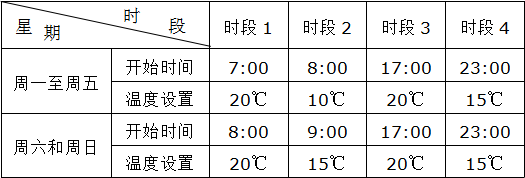 請(qǐng)注意:下表為"5+2"制熱編程模式下時(shí)段的開(kāi)始時(shí)間與溫度初始數(shù)值表。